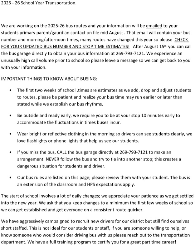 “These rules are posted to provide each student with the best chance of riding the bus successfully and safely. Riding the bus is a privilege and failure to comply with these rules may result in Suspension of Bus privileges.” – The Transportation Supervisor